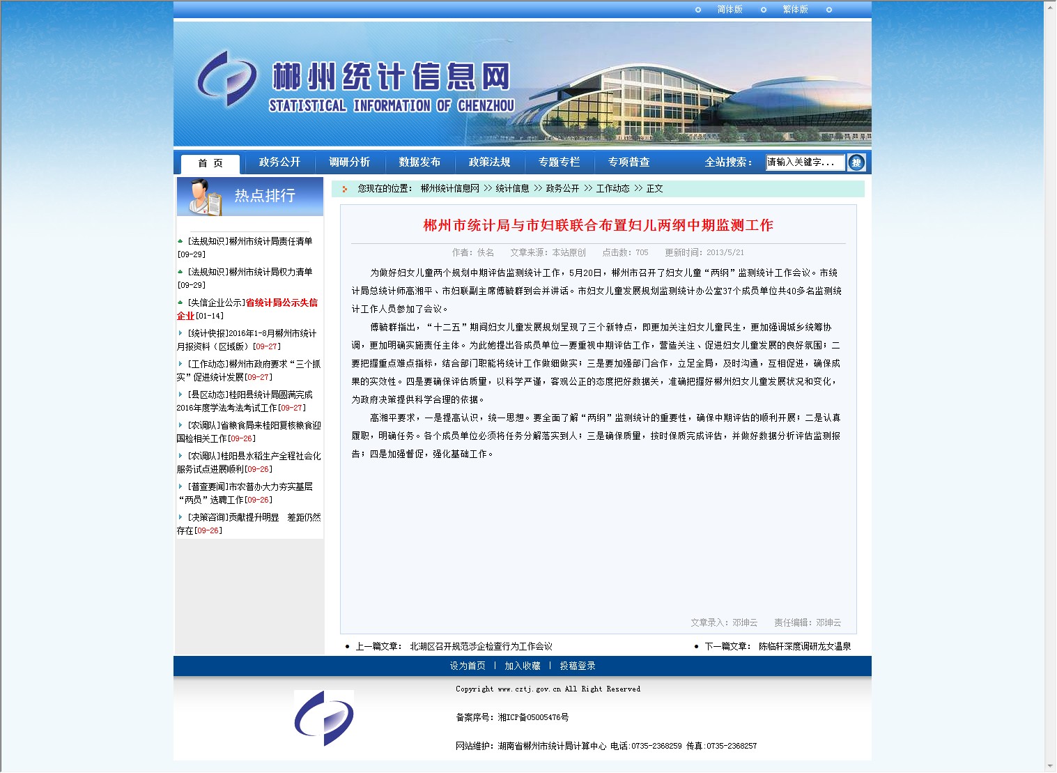 为做好妇女儿童两个规划中期评估监测统计工作,5月20日,郴州市召开了妇女儿童“两纲”监测统计工作会议。市统计局总统计师高湘平、市妇联副主席傅毓群到会并讲话。市妇女儿童发展规划监测统计办公室37个成员单位共40多名监测统计工作人员参加了会议。