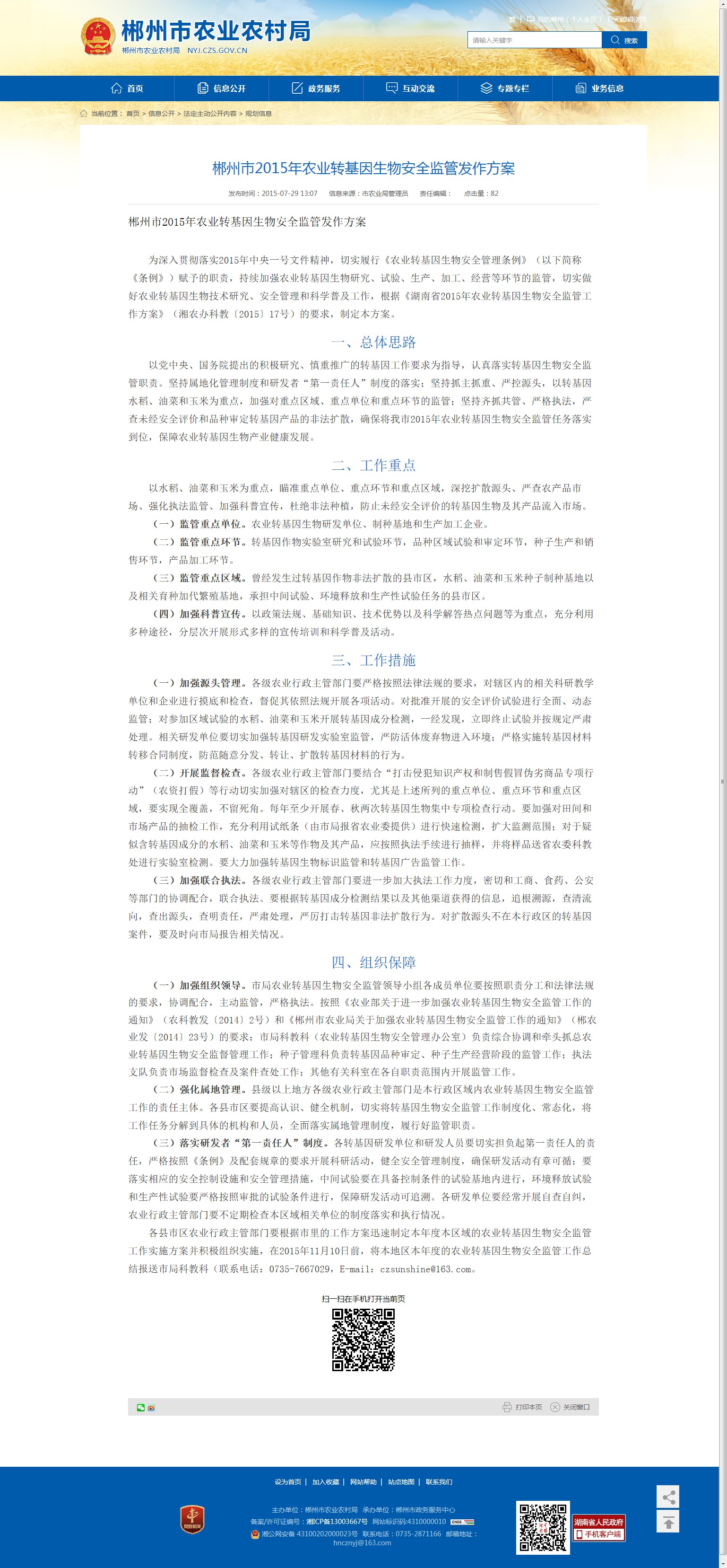 各县市区农业行政主管部门要根据市里的工作方案迅速制定本年度本区域的农业转基因生物安全监管工作实施方案并积极组织实施,在2015年11月10日前,将本地区本年度的农业转基因生物安全监管工作总结报送市局科教科(联系电话:0735-7667029,E-mail:czsunshine@163.com。