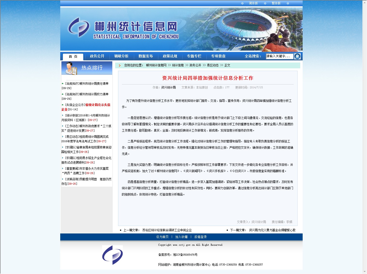三是加大奖励力度,明确统计信息分析目标任务。严格按照年初工作部署要求,下发文件进一步细化各专业信息分析工作目标,并严格奖惩机制,加大了对《郴州统计信息网》、《资兴新闻网》、《资兴手机报》、《今日资兴》、市委信息室采用的稿酬标准。
