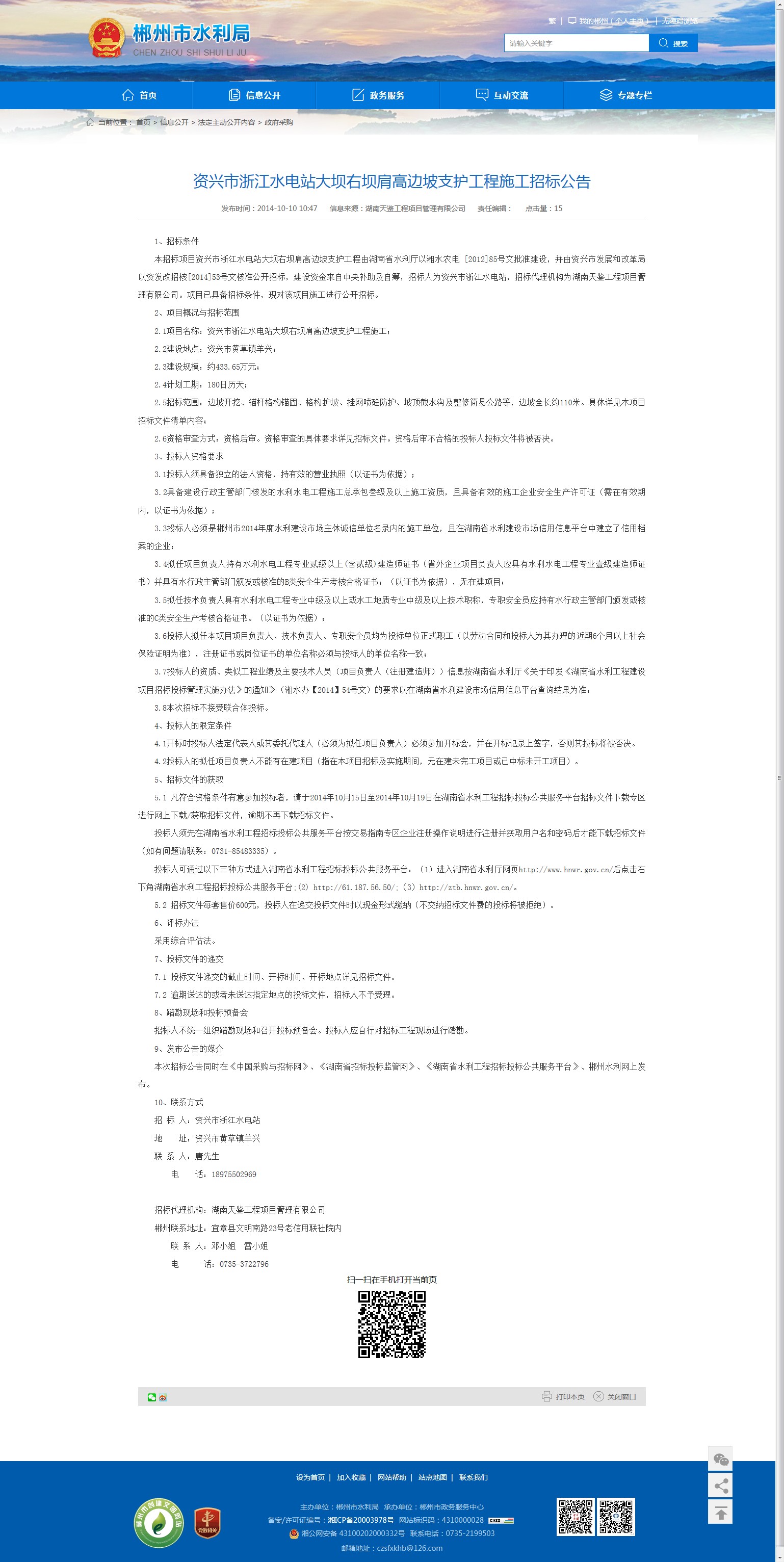 本次招标公告同时在《中国采购与招标网》、《湖南省招标投标监管网》、《湖南省水利工程招标投标公共服务平台》、郴州水利网上发布。