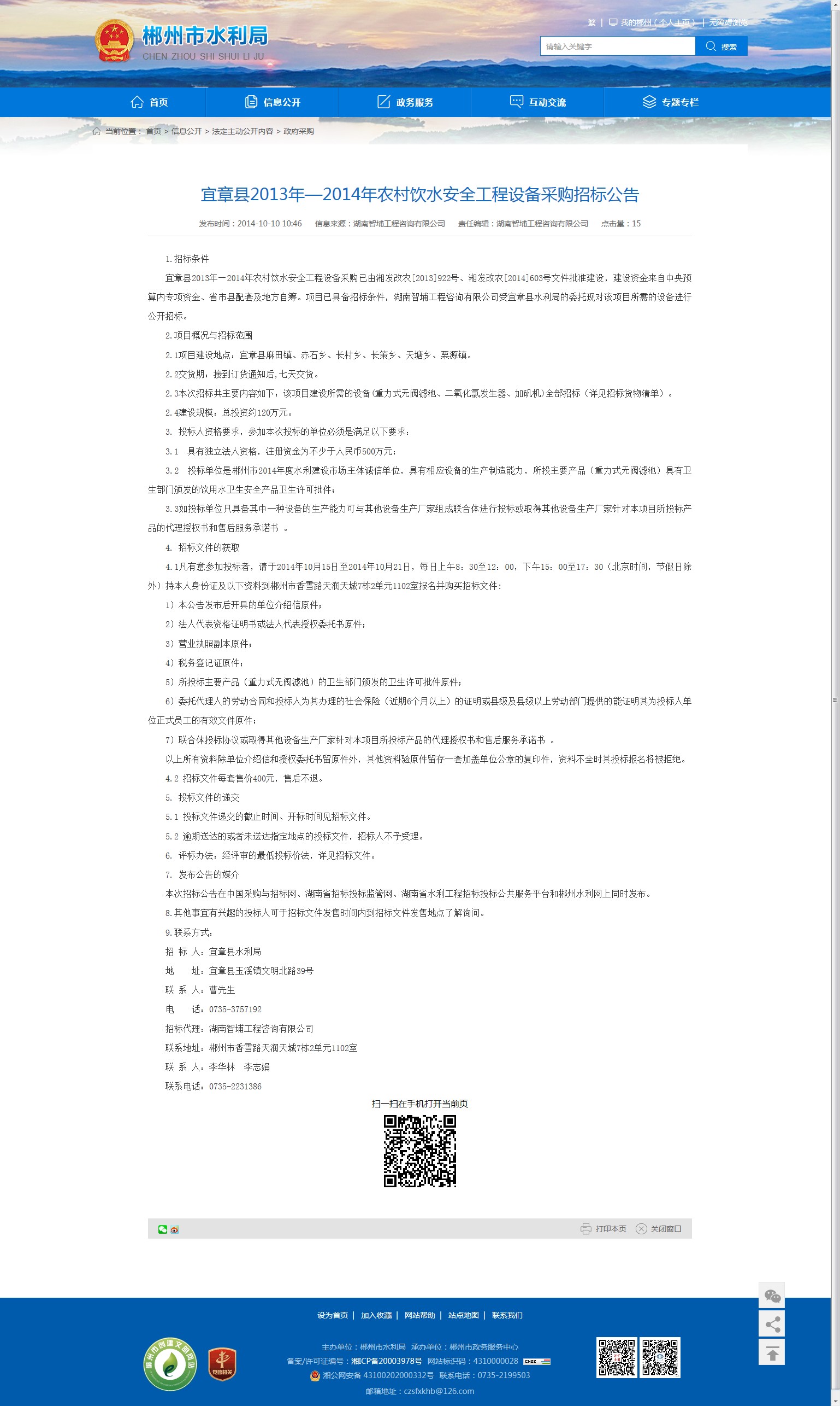 本次招标公告在中国采购与招标网、湖南省招标投标监管网、湖南省水利工程招标投标公共服务平台和郴州水利网上同时发布。