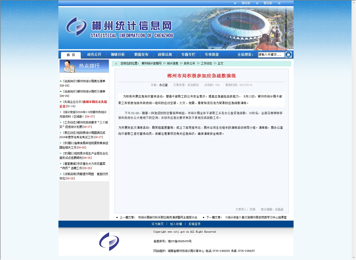 为积极开展应急知识宣传活动,增强干部职工的公共安全意识,提高应急避险自救能力, 5月13日,郴州市统计局干部职工积极参加由市政府统一组织的应对空袭、火灾、地震、滑坡和泥石流为背景的应急疏散演练。
