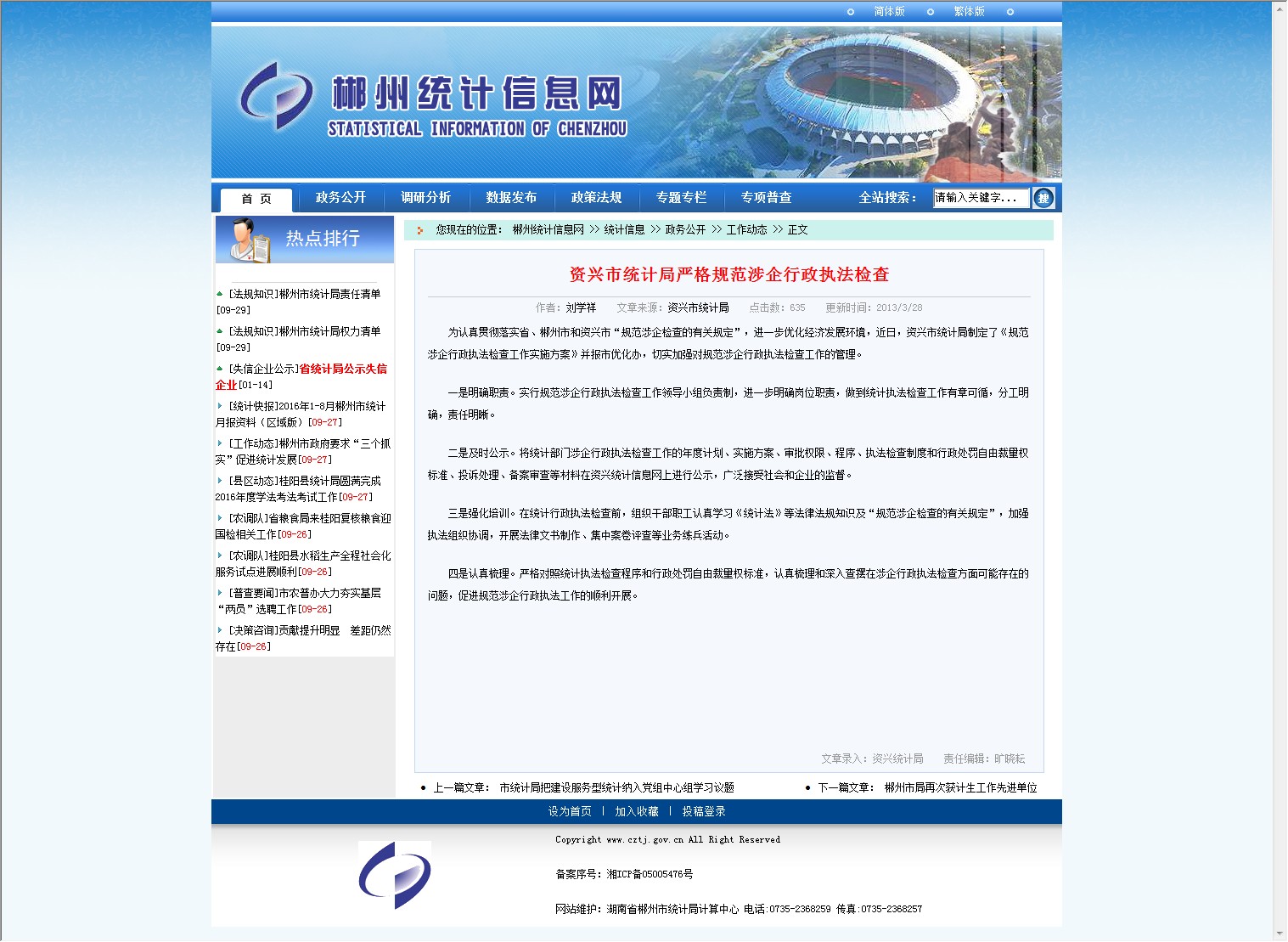 为认真贯彻落实省、郴州市和资兴市“规范涉企检查的有关规定”,进一步优化经济发展环境,近日,资兴市统计局制定了《规范涉企行政执法检查工作实施方案》并报市优化办,切实加强对规范涉企行政执法检查工作的管理。