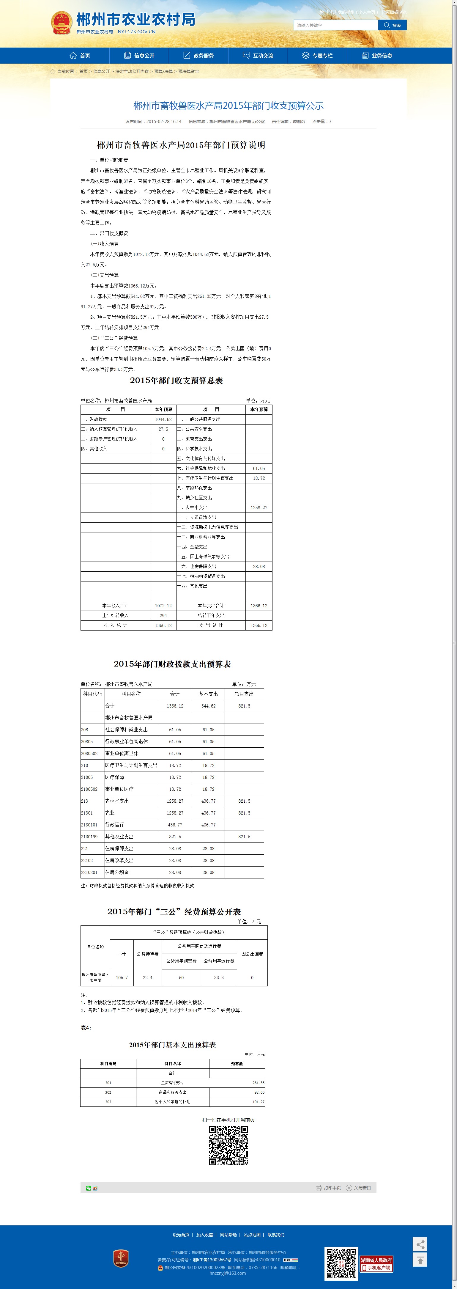 郴州市畜牧兽医水产局2015年部门预算说明 一、单位职能职责 郴州市畜牧兽医水产局为正处级单位,主管全市养殖业工作。局机关设9个职能科室,定全额拨款事业编制37名。直属全额拨款事业单位3个,编制16名,主要职责是负责组织实施《畜牧法》、《渔业法》、《动物防疫法》、《农产品质量安全法》等法律法规,研究制定全市养殖业发展战略和规划等多项职能。担负全市饲料兽药监管、动物卫生监督、兽医行政、渔政管理等行业执法,重大动物疫病防控,畜禽水产品质量安全,养殖业生产指导及服务等主要工作。 二、部门收支概况 (一)收入预算 本年度收入预算数为1072.12万元,其中财政拨款1044.62万元,纳入预算管理的非税收入27.5万元。 (二)支出预算 本年度支出预算数1366.12万元。 1、基本支出预算数544.62万元。其中工资福利支出261.35万元,对个人和家庭的补助191.27万元,一般商品和服务支出92万元。 2、项目支出预算数821.5万元。其中本年预算数500万元,非税收入安排项目支出27.5万元,上年结转安排项目支出294万元。 (三)“三公”经费预算 本年度“三公”经费预算105.7万元,其中公务接待费22.4万元,公款出国(境)费用0元,因单位专用车辆到期报废及业务需要,预算购置一台动物防疫采样车,公车购置费50万元与公车运行费33.3万元。 2015年部门收支预算总表 |