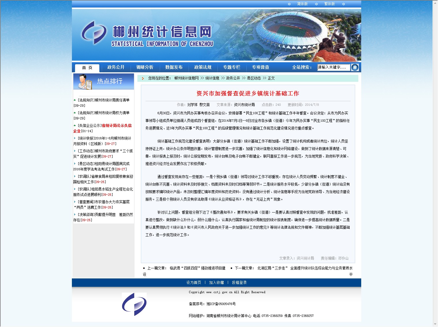 统计基础工作规范化建设督查表明:大部分乡镇(街道)统计基础工作不断加强,设置了统计机构或者统计岗位,统计人员坚持持证上岗,统计办公条件明显改善,统计管理制度进一步完善,加强了统计信息化和统计网络建设,做到了统计数据来源清楚、可靠,统计报表上报及时,统计公报定期发布,统计台帐及电子台帐不断健全,联网直报工作进一步规范,为当地党委、政府科学决策、推进资兴经济社会发展作出了积极贡献。