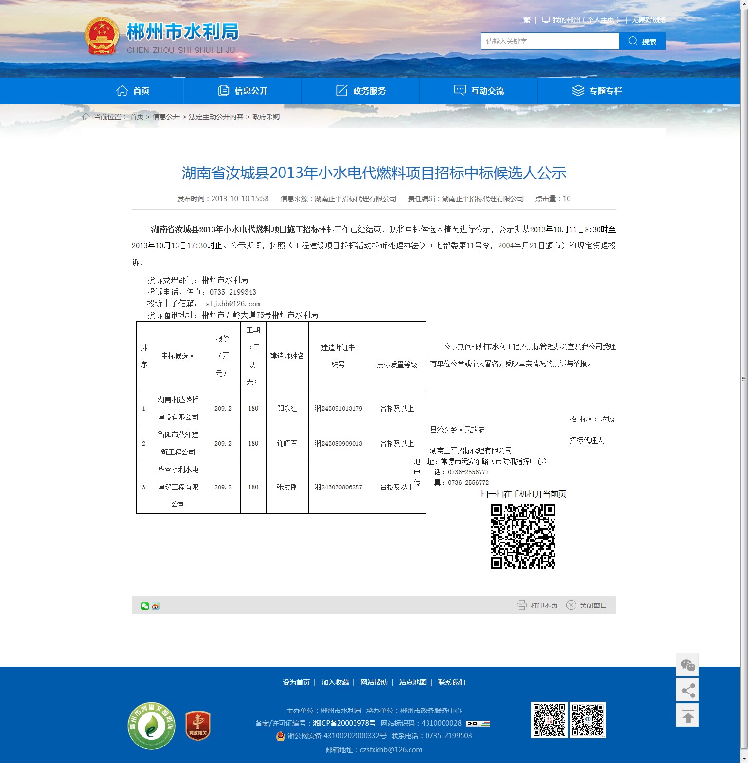 公示期间郴州市水利工程招投标管理办公室及我公司受理有单位公章或个人署名,反映真实情况的投诉与举报。