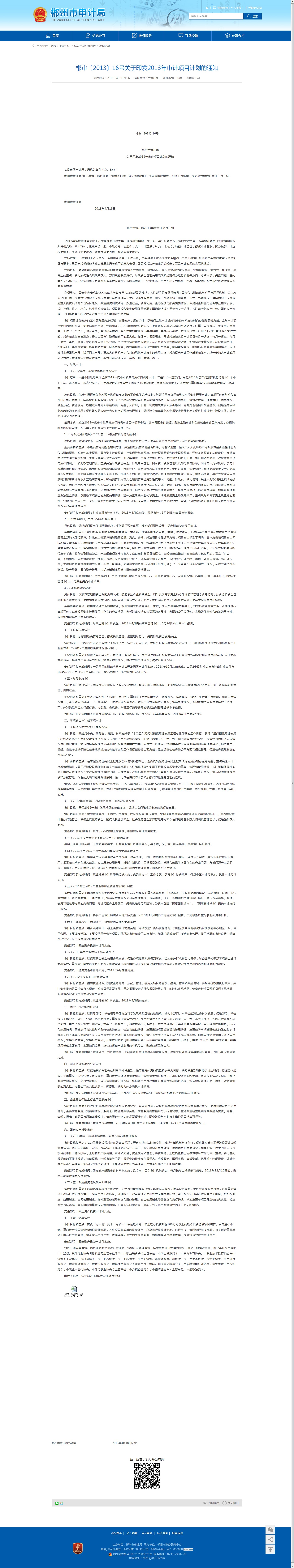 郴州市审计局2013年审计项目计划已报市长批准,现印发给你们,请认真组织实施,抓好工作落实,优质高效完成好审计工作任务。