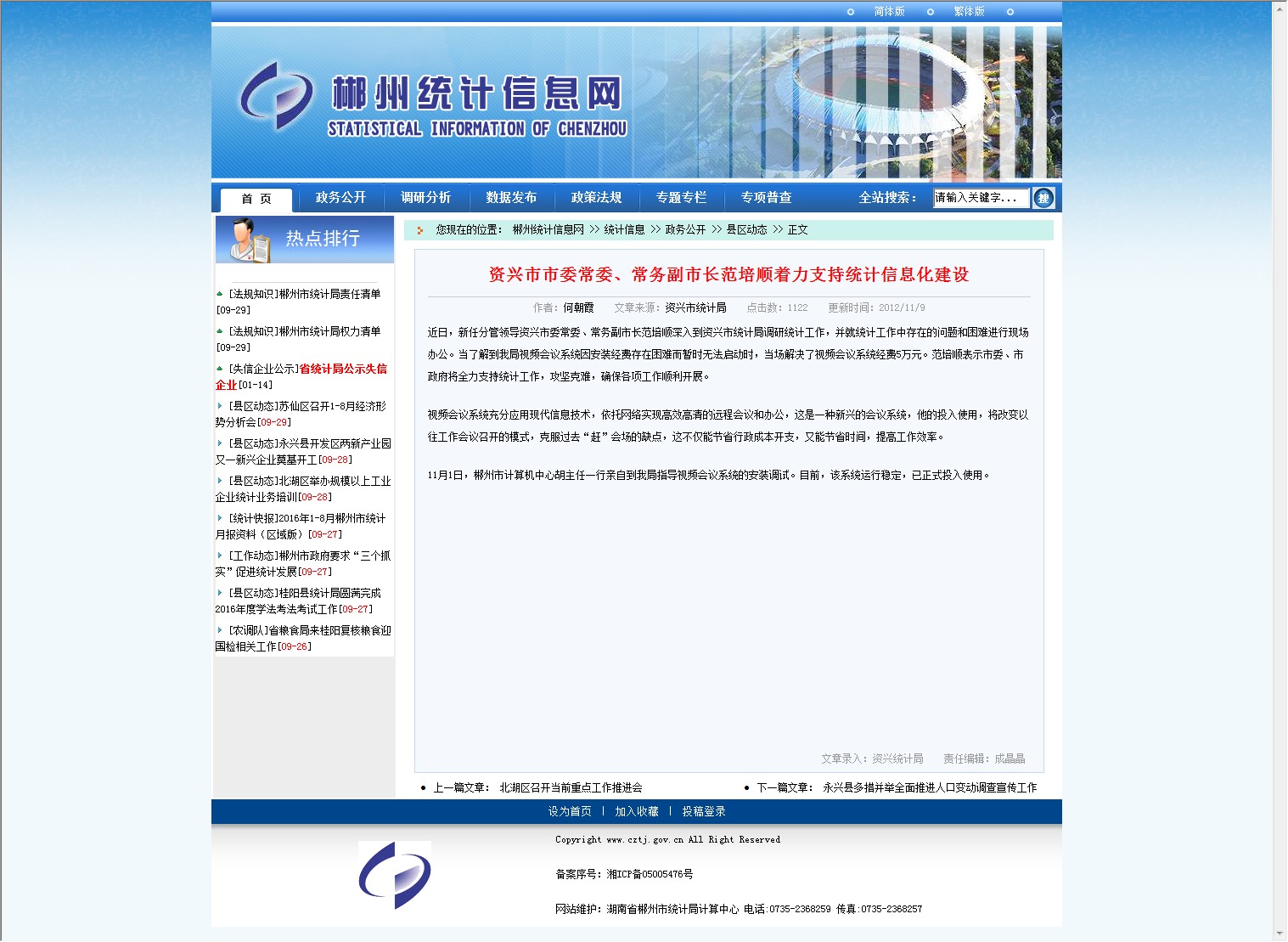 11月1日,郴州市计算机中心胡主任一行亲自到我局指导视频会议系统的安装调试。目前,该系统运行稳定,已正式投入使用。