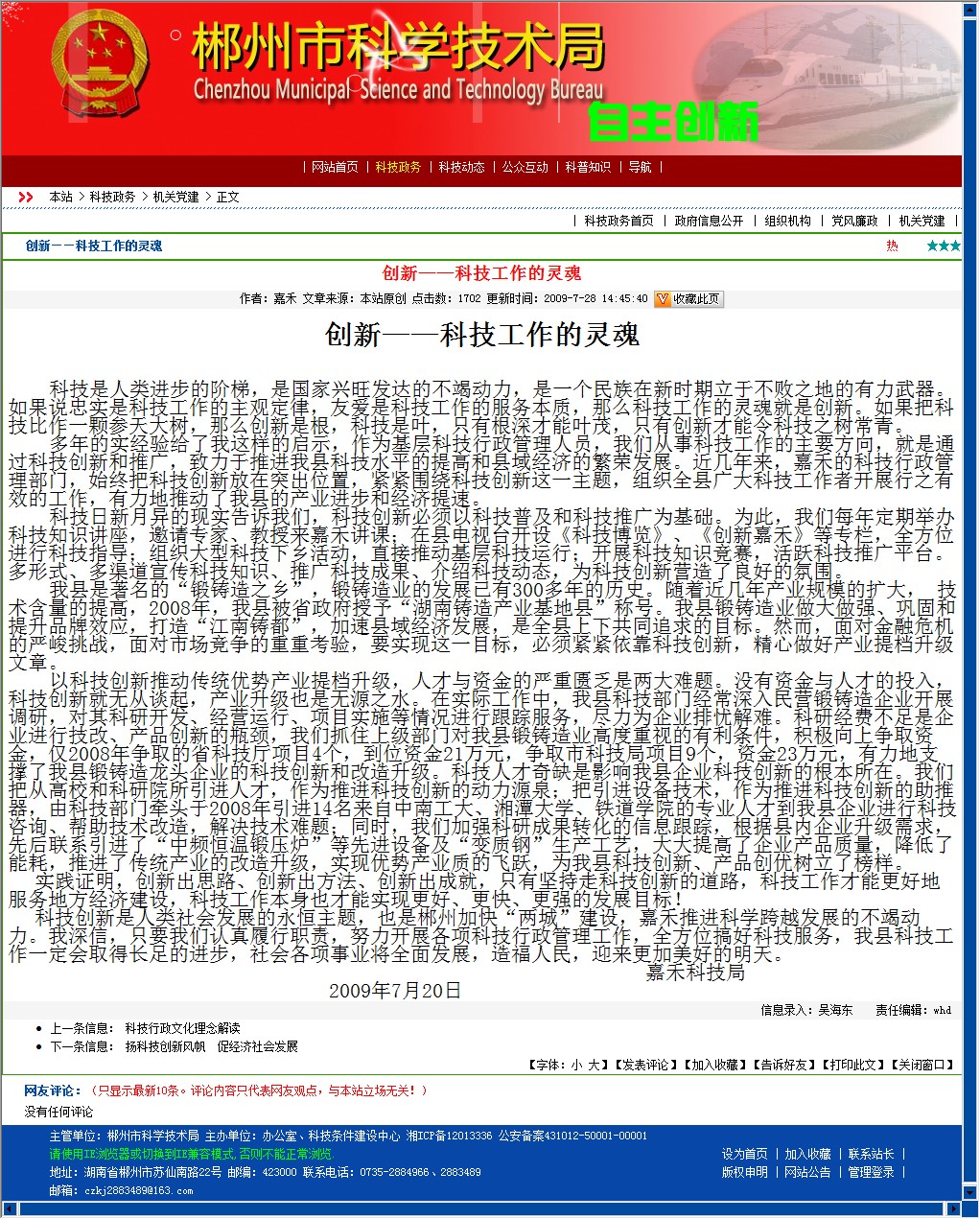 科技创新是人类社会发展的永恒主题,也是郴州加快“两城”建设,嘉禾推进科学跨越发展的不竭动力。我深信,只要我们认真履行职责,努力开展各项科技行政管理工作,全方位搞好科技服务,我县科技工作一定会取得长足的进步,社会各项事业将全面发展,造福人民,迎来更加美好的明天。