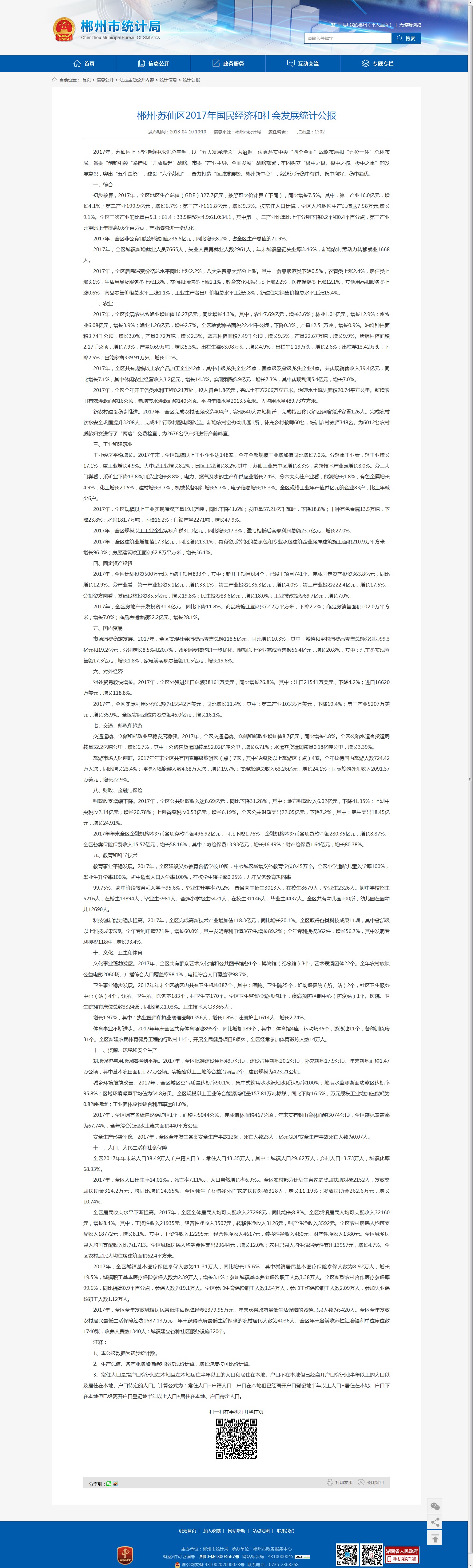 2017年,苏仙区上下坚持稳中求进总基调,以“五大发展理念”为遵循,认真落实中央“四个全面”战略布局和“五位一体”总体布局、省委“创新引领“举措和“开放崛起”战略、市委“产业主导、全面发展”战略部署,牢固树立“极中之极、极中之核、极中之重”的发展意识,突出“五个围绕”,建设“六个苏仙”,奋力打造“区域发展极、郴州新中心”,经济运行稳中有进、稳中向好、稳中趋优。