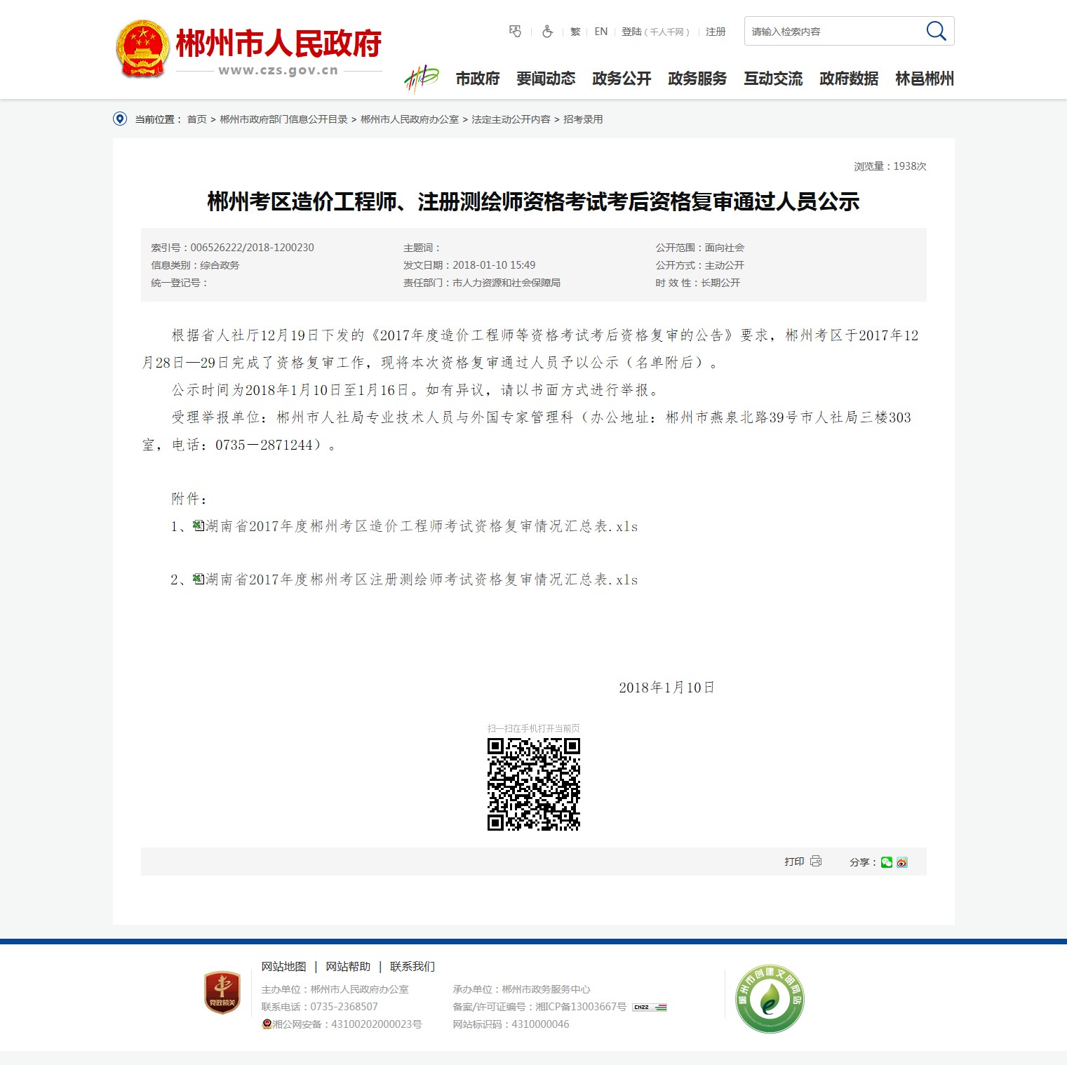 根据省人社厅12月19日下发的《2017年度造价工程师等资格考试考后资格复审的公告》要求,郴州考区于2017年12月28日—29日完成了资格复审工作,现将本次资格复审通过人员予以公示(名单附后)。
