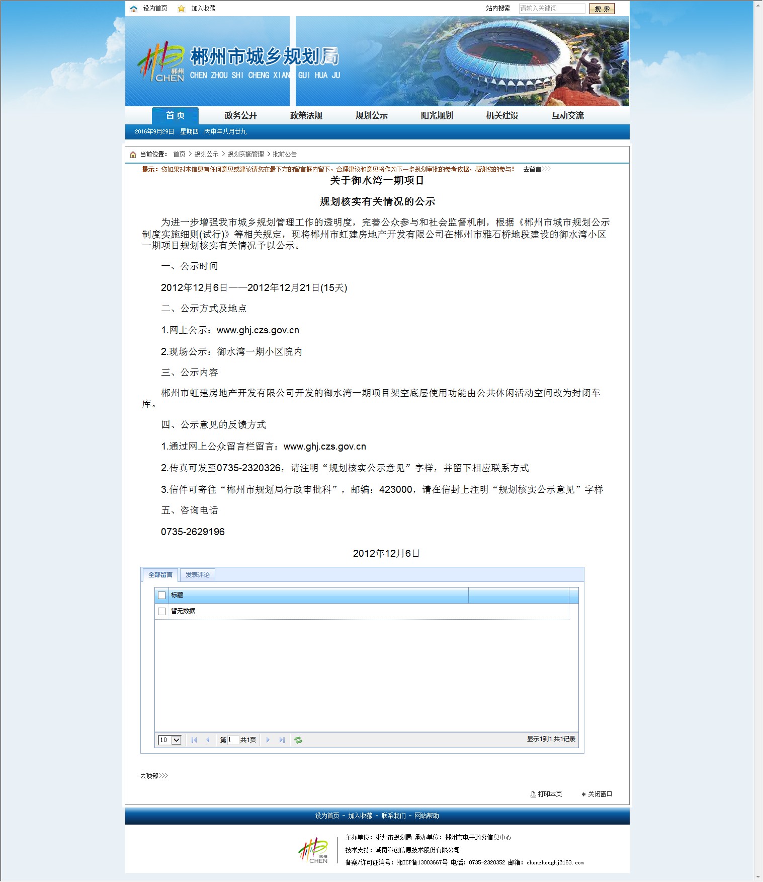 为进一步增强我市城乡规划管理工作的透明度,完善公众参与和社会监督机制,根据《郴州市城市规划公示制度实施细则(试行)》等相关规定,现将郴州市虹建房地产开发有限公司在郴州市雅石桥地段建设的御水湾小区一期项目规划核实有关情况予以公示。