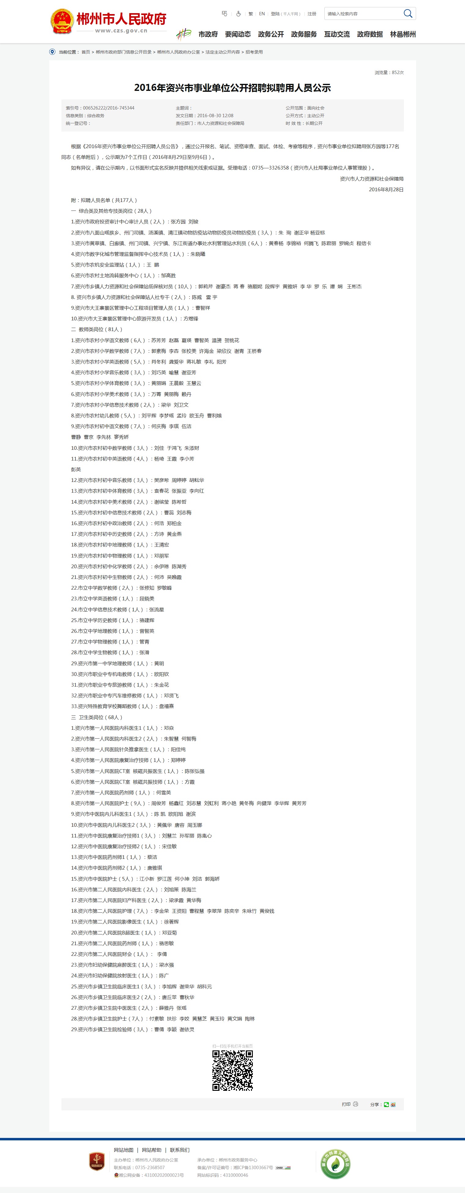 根据《2016年资兴市事业单位公开招聘人员公告》,通过公开报名、笔试、资格审查、面试、体检、考察等程序,资兴市事业单位拟聘用张方园等177名同志(名单附后),公示期为7个工作日(2016年8月29日至9月6日)。