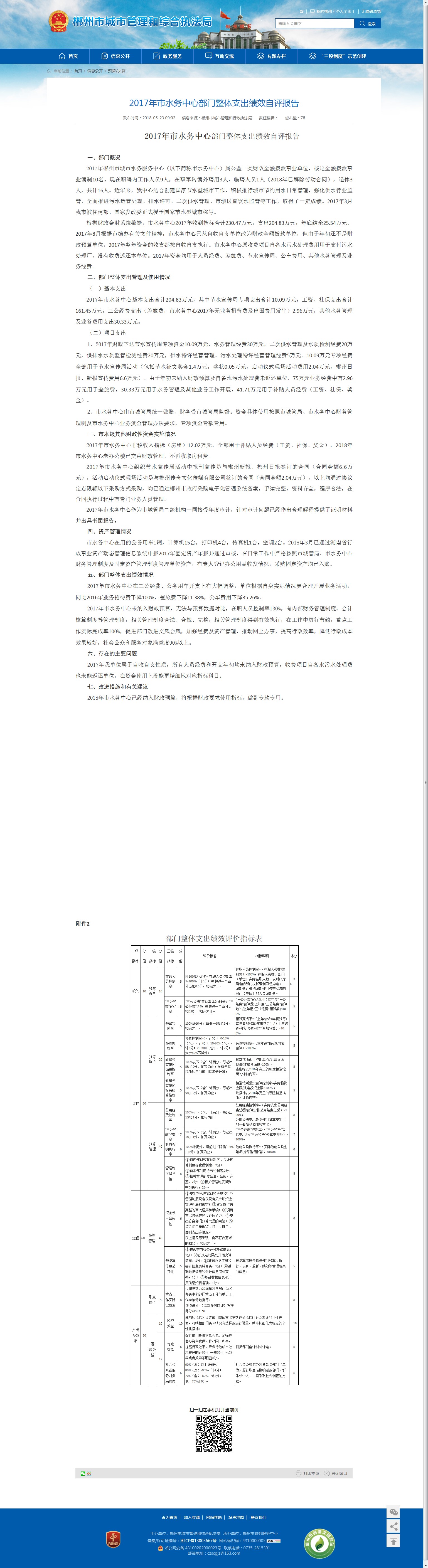 2017年市水务中心未纳入财政预算,无法与预算数据对比,在职人员控制率130%,有内部财务管理制度、会计核算制度等管理制度,相关管理制度合法、合规、完整,相关管理制度得到有效执行,在工作中厉行节约,重点工作实际完成率100%,促进部门改进文风会风,加强经费及资产管理,推动网上办事,提高行政效率,降低行政成本效果较好,社会公众和服务对象满意度90%以上。