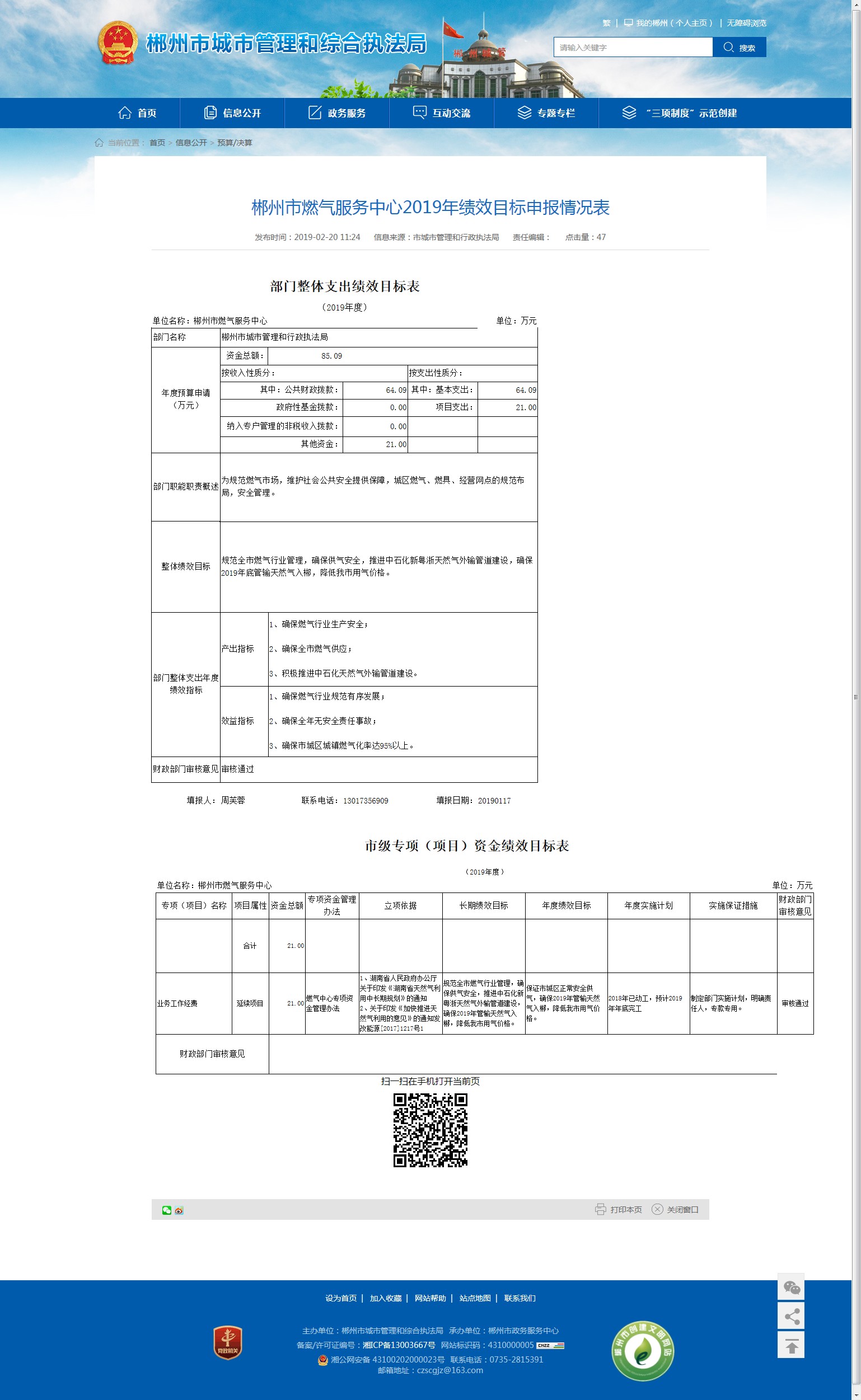 | 整体绩效目标 | 规范全市燃气行业管理,确保供气安全,推进中石化新粤浙天然气外输管道建设,确保2019年底管输天然气入郴,降低我市用气价格。 | ||||||||||