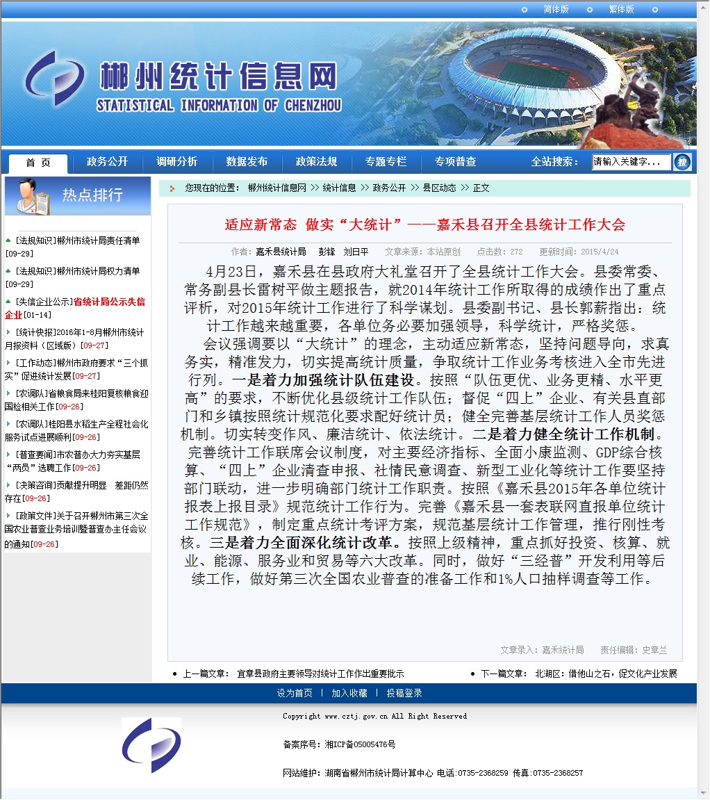 会议强调要以“大统计”的理念,主动适应新常态,坚持问题导向,求真务实,精准发力,切实提高统计质量,争取统计工作业务考核进入全市先进行列。一是着力加强统计队伍建设。按照“队伍更优、业务更精、水平更高”的要求,不断优化县级统计工作队伍;督促“四上”企业、有关县直部门和乡镇按照统计规范化要求配好统计员;健全完善基层统计工作人员奖惩机制。切实转变作风、廉洁统计、依法统计。二是着力健全统计工作机制。完善统计工作联席会议制度,对主要经济指标、全面小康监测、GDP综合核算、“四上”企业清查申报、社情民意调查、新型工业化等统计工作要坚持部门联动,进一步明确部门统计工作职责。按照《嘉禾县2015年各单位统计报表上报目录》规范统计工作行为。完善《嘉禾县一套表联网直报单位统计工作规范》,制定重点统计考评方案,规范基层统计工作管理,推行刚性考核。三是着力全面深化统计改革。按照上级精神,重点抓好投资、核算、就业、能源、服务业和贸易等六大改革。同时,做好“三经普”开发利用等后续工作,做好第三次全国农业普查的准备工作和1%人口抽样调查等工作。