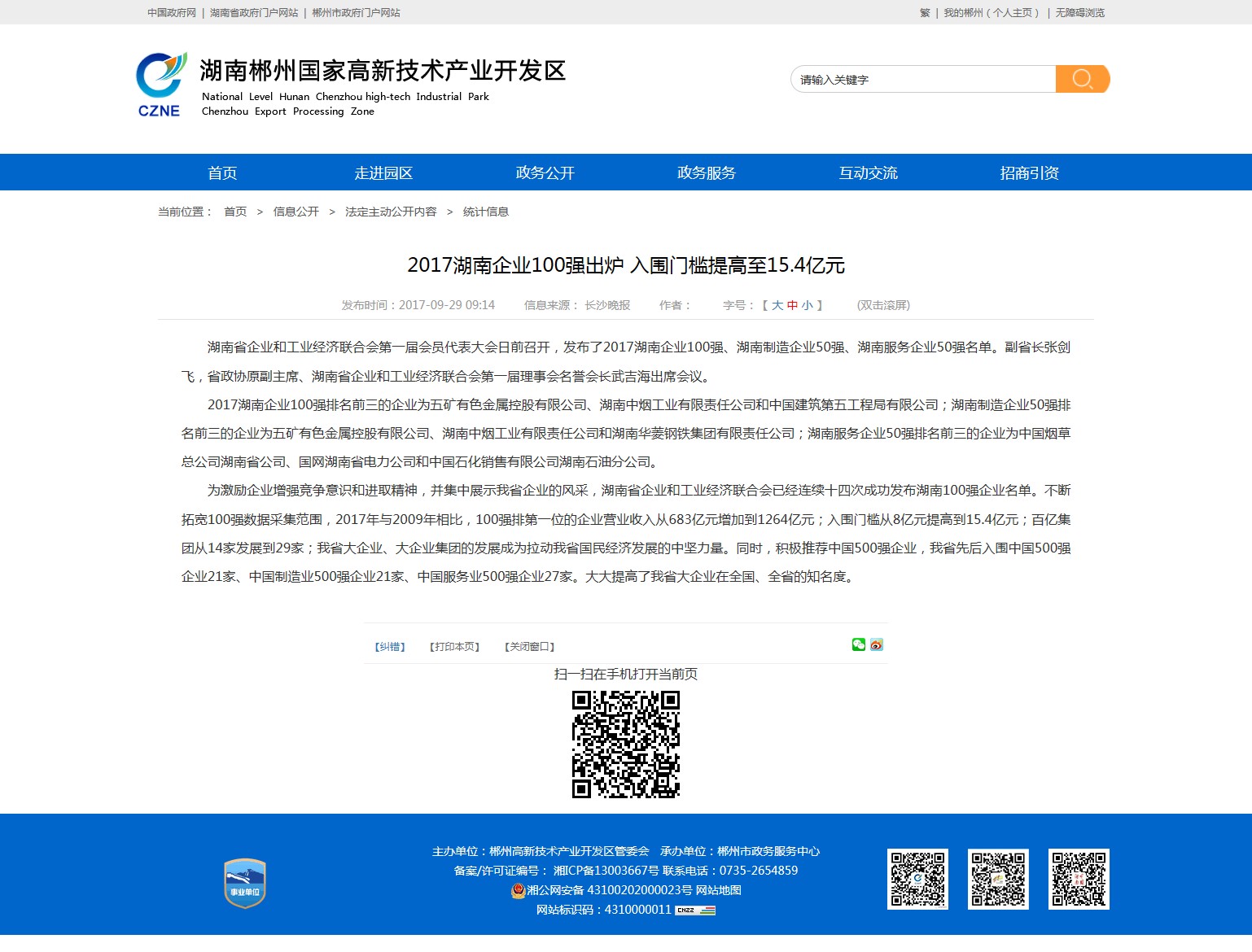 为激励企业增强竞争意识和进取精神,并集中展示我省企业的风采,湖南省企业和工业经济联合会已经连续十四次成功发布湖南100强企业名单。不断拓宽100强数据采集范围,2017年与2009年相比,100强排第一位的企业营业收入从683亿元增加到1264亿元;入围门槛从8亿元提高到15.4亿元;百亿集团从14家发展到29家;我省大企业、大企业集团的发展成为拉动我省国民经济发展的中坚力量。同时,积极推荐中国500强企业,我省先后入围中国500强企业21家、中国制造业500强企业21家、中国服务业500强企业27家。大大提高了我省大企业在全国、全省的知名度。