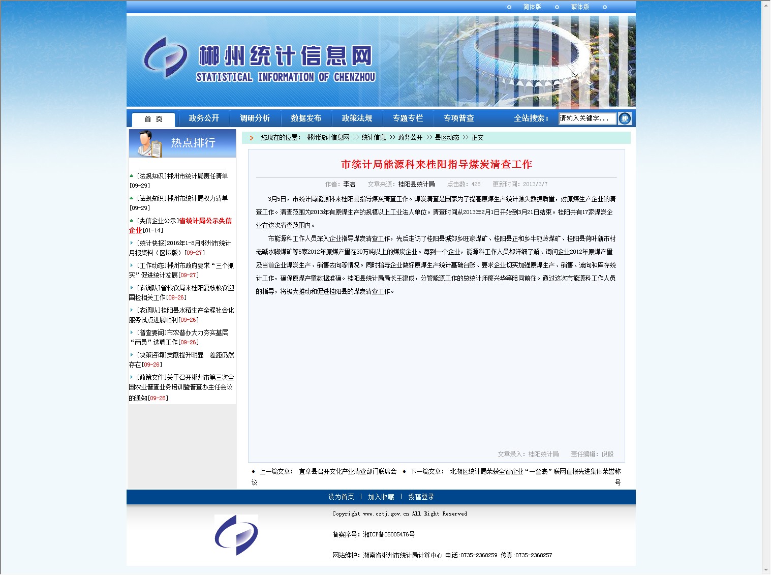 3月5日,市统计局能源科来桂阳县指导煤炭清查工作。煤炭清查是国家为了提高原煤生产统计源头数据质量,对原煤生产企业的清查工作。清查范围为2013年有原煤生产的规模以上工业法人单位。清查时间从2013年2月1日开始到3月21日结束。桂阳共有17家煤炭企业在这次清查范围内。