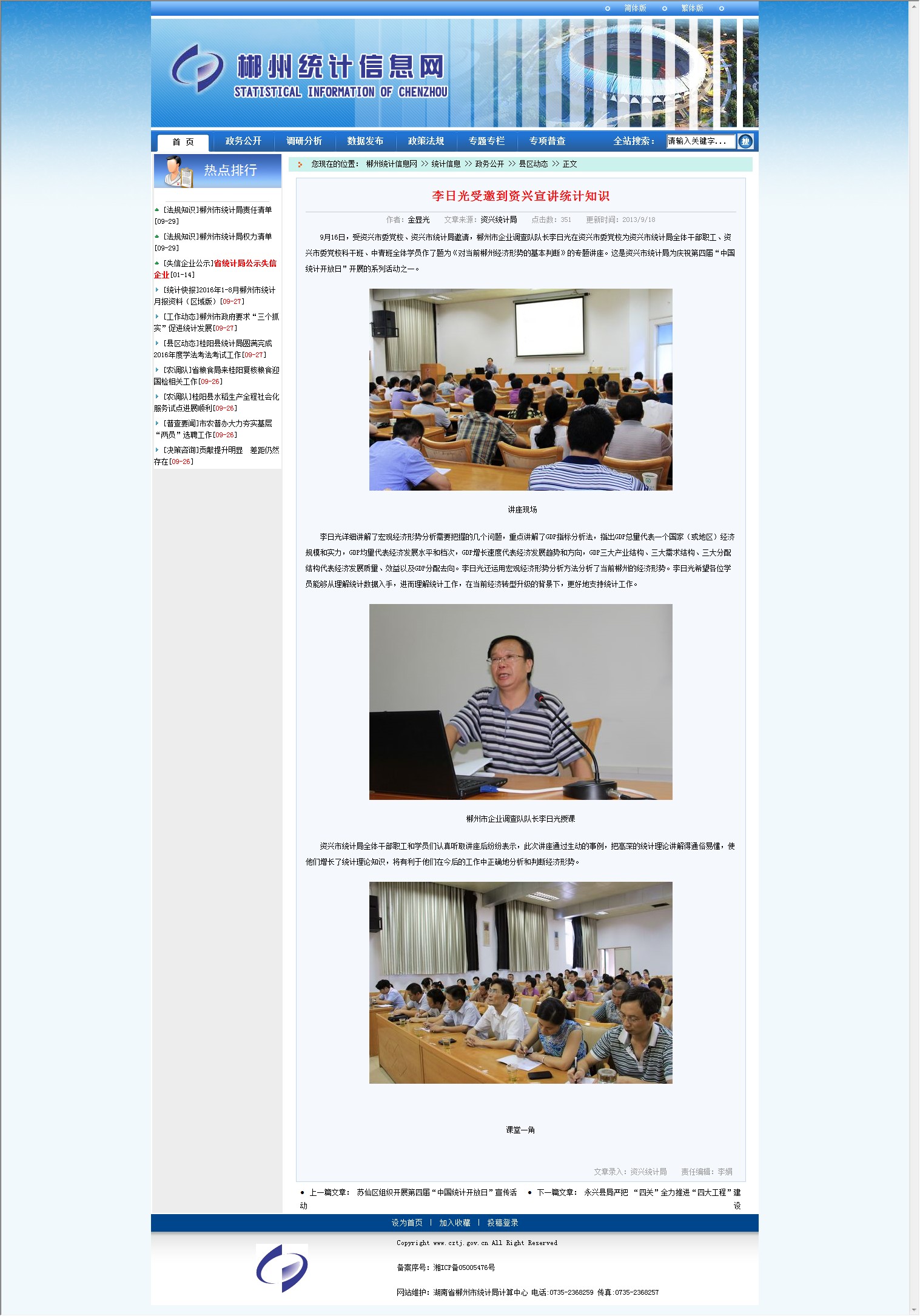 9月16日,受资兴市委党校、资兴市统计局邀请,郴州市企业调查队队长李日光在资兴市委党校为资兴市统计局全体干部职工、资兴市委党校科干班、中青班全体学员作了题为《对当前郴州经济形势的基本判断》的专题讲座。这是资兴市统计局为庆祝第四届“中国统计开放日”开展的系列活动之一。