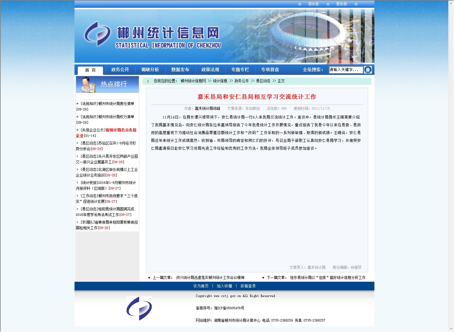 11月14日,在局长谭兴禄带领下,安仁县统计局一行6人来我局交流统计工作。座谈中,县统计局局长王晴简要介绍了我局基本情况后,向安仁统计局各位来嘉领导报告了今年我县统计工作开展情况,重点报告了我县今年以来在县委、县政府的高度重视下为推动社会消费品零售总额统计工作和“改码”工作采取的一系列新举措、取得的新成绩。王晴说,安仁县局近年来统计工作成绩斐然,收到省、市局领导的肯定和同仁们的好评,号召全局干部职工认真向安仁县局学习,并接受安仁局邀请择日赴安仁学习该局先进工作经验和优秀的工作方法。我局全体领导班子成员参加座谈。