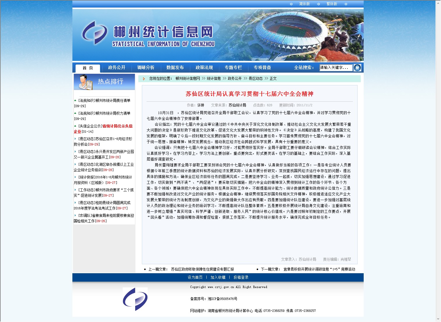 10月31日 ,苏仙区统计局党组召开全局干部职工会议,认真学习了党的十七届六中全会精神,并对学习贯彻党的十七届六中全会精神作了安排部署。